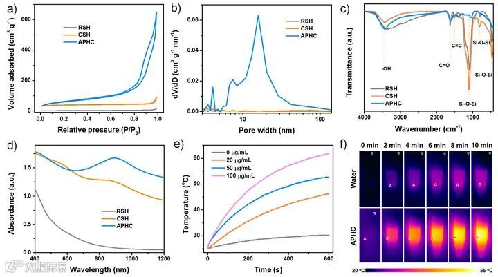 氮气吸脱附等表明,相对于RSH和CSH,APHC具有丰富的多级孔道结构。红外以及XPS等表征表明二氧化硅已被清除。此外,APHC展示出了优异的近红外吸收峰(近980 nm),因此其具有较好的光热效应。在1.5 W cm−2的980 nm近红外激光照射下,50 μg/mL的APHC溶液可以快速升温到52.8 ℃。
