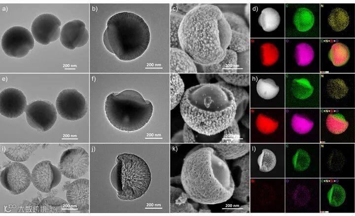 材料的电镜表征图如图2所示。不对称的RSH和CSH具有一个粗糙表面的大半球,和一个光滑表面的小半球,且通过EDS mapping图片可以看出其小半球为酚醛树脂材料,大半球为酚醛树脂/二氧化硅复合材料。不对称的APHC则具有中空结构,一个光滑实心的小半球壳和一个具有多孔结构的大半球壳,且主要是酚醛树脂衍生的碳材料。