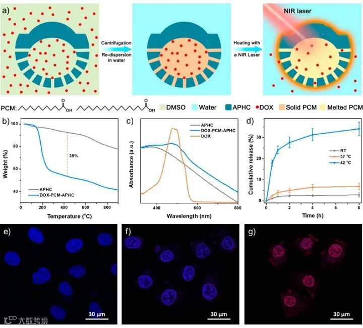 随后,作者将抗癌药物阿霉素(DOX)作为货物模型分子与相变材料封装入APHC内部(图6)。由于相变材料的熔点为39 ℃,略高于人体温度,因此在近红外照射下,APHC自身的光热性能将快速提升材料温度,达到相变点后,相变材料将于DOX一同释放,实现货物的可控装载及卸载。结果显示相变材料与DOX约占总质量的39%,紫外可见光谱等证明DOX装载于APHC当中。货物卸载实验结构显示,在高于相变温度后可以有效实现货物卸载。最后,作者探究了该复合纳米货车的治疗效果,结果显示其在近红外照射下可以快速释放DOX进行化学治疗,同时其光热性能也可以达到光热治疗的效果,在化疗与光热治疗的协同作用下,其治疗效果最优。