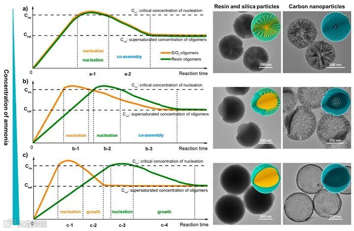 随后,作者对材料形成机理进行了一系列探究。研究表明,在催化剂氨水浓度较大的情况下,随着催化剂含量的提升,TEOS的水解聚合速率随之提高,而酚醛树脂前驱体的聚合速率会受到抑制逐渐减小。因此可以通过催化剂的含量来调节两种前驱体的聚合反应速率,进而通过动力学调控材料的结构。如图4a所示,在相对较小的催化剂浓度下,两种前驱体的聚合反应速率相近,其低聚物浓度同步快速增加,在达到成核浓度后快速成核、共组装,得到放射状的纳米复合材料,经过碳化及除二氧化硅后得到具有放射状多孔结构的纳米碳球。如图4b和图1所示,在相对适中的催化剂浓度下,TEOS的水解聚合速率增加,其低聚物浓度先高于成核浓度,因此快速成核生长得到二氧化硅纳米球。随后,酚醛树脂低聚物浓度高于成核浓度,由于二氧化硅数量较多,因此其将优先在二氧化硅表面异相成核生长,通过岛状结构模式生长,生成不对称结构复合材料。随着酚醛树脂尺寸的逐步增加,由于尺寸效应限制了其进一步生长,而此时的酚醛树脂低聚物浓度依然较高,因此二种低聚物将在二氧化硅另一侧表面进行共组装,得到放射状薄层。经过高温碳化及除二氧化硅处理,可制备得到APHC。如图4c所示,在相对较高的催化剂浓度下,TEOS的水解聚合速率远远大于酚醛树脂的聚合速率。因此二氧化硅球在初始阶段大量生成,随着酚醛树脂低聚物浓度的缓慢增加,其将在二氧化硅表面缓慢均匀成核生长,得到核壳结构复合材料。经过高温及除二氧化硅处理后,可得到中空的纳米碳材料。此外,不同结构的复合材料及其衍生碳材料的结构依然可以通过反应速率进行细微调节。