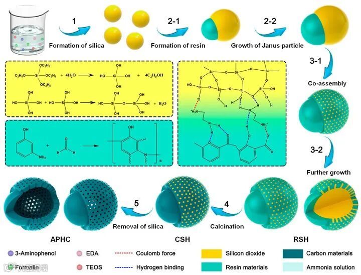 如图1所示,硅酸四乙酯(TEOS)作为硅源,间氨苯酚及甲醛作为酚醛树脂及碳前驱体,氨水作为催化剂,乙二胺作为粘结剂。在合适的反应速率下,TEOS快速水解聚合生成二氧化硅球(步骤1)。随后,酚醛树脂快速产生,在二氧化硅球表面进行岛状生长得到不对称的复合材料(步骤2)。随着反应的进行,由于尺寸效应的影响,酚醛树脂低聚物将会在二氧化硅球的另一侧表面进行成核,与二氧化硅共组装生长,得到放射状复合层,最终得到不对称的酚醛树脂/二氧化硅复合纳米颗粒(RSH,步骤3)。RSH经过高温碳化后得到不对称的碳/二氧化硅复合纳米颗粒(CSH,步骤4)。进一步除去CSH中的二氧化硅,可以得到目标产物——不对称多孔中空纳米碳材料(APHC,步骤5)。