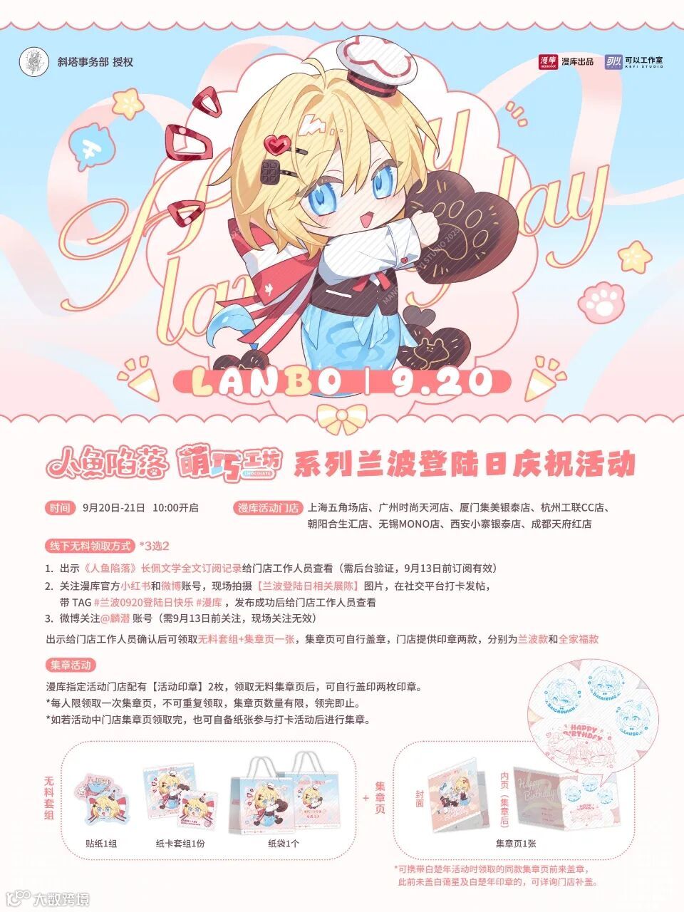 2、关注漫库官方账号,现场拍摄【兰波登陆日相关展陈】图片,在社交平台打卡发帖,带 TAG #兰波0920登陆日快乐 #漫库 ,发布成功后给门店工作人员查看;