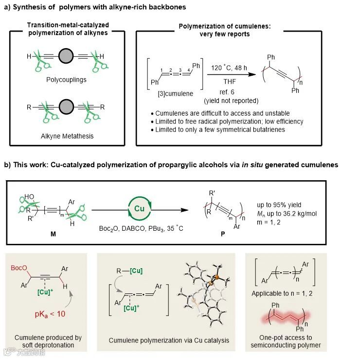 近日,北京大学朱戎课题组实现了经由累积多烯中间体的炔丙醇的形式脱水聚合反应,高效地合成了独特的“头对头”炔烃主链聚合物(Mn可达36.2 kg/mol,产率可达95%以上)(图1)。该策略的核心在于铜物种参与的单体和聚合物链端平行活化:(1)通过单体配位炔丙位去质子串联β-消除,可以在温和的条件下原位生成累积多烯;(2)链端亲核性有机铜物种可介导低能垒的累积多烯加聚过程,避免不稳定的累积多烯发生副反应。该聚合方法单体易得,兼容包括自由基受体在内的众多常见官能团,且可适用于极具挑战性的非对称结构的丁三烯以及更高级累积多烯的聚合。作者进一步展示了该聚合反应可以与异构化串联,直接一锅法得到传统方法难以合成的“头对头”型聚苯乙炔 (HH-PPA),其具备优异的稳定性和溶解性,并在掺杂后显示良好的导电性。
