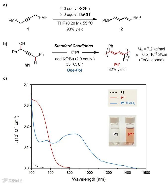 作者利用碱催化下炔烃向二烯的高效异构化反应实现了炔烃聚合物主链异构化,通过一锅法合成了共轭高分子P1':头头相连的聚苯乙炔 (HH-PPA)。该聚合物经三氯化铁掺杂后具有良好的导电性(图3),且具备良好的溶解性和稳定性,是一类颇具潜力的新型共轭高分子。