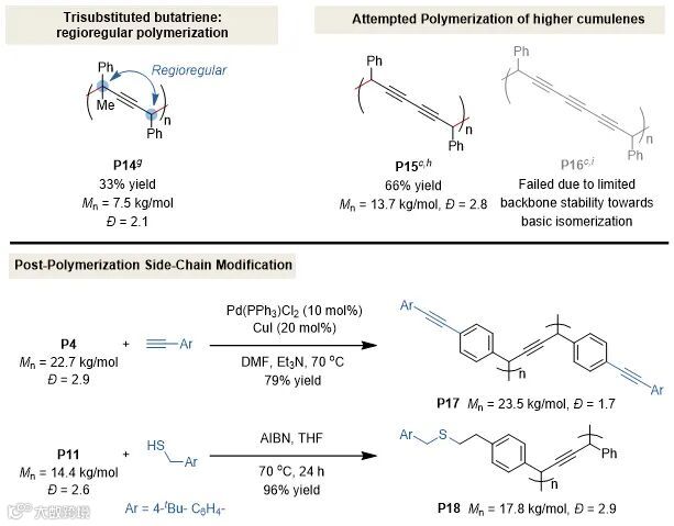 经过条件优化,作者使用阳离子铜(I)/膦配体作为催化剂,DABCO作为碱,在Boc2O活化试剂的存在下,近室温下实现了炔丙醇的高效脱水聚合。该方法能兼容芳环邻位的位阻基团 (P2)、卤素 (P3, P4)、烷基醚和硅醚 (P5, P6)、酯基 (P10)。聚合反应不能被BHT所抑制,且含有苯乙烯结构的单体能成功聚合而不会发生交联 (P11, P12),进一步这说明该聚合过程是铜催化的聚合,而不太可能是自由基聚合,这些官能团可用于聚合后侧链修饰(P17-P18)。该聚合方法可以适用于单芳基取代的累积三烯 (P13)、三取代的累积三烯 (P14)、甚至累积五烯 (P15)。原位生成的累积七烯也可聚合,但是主链在弱碱性条件下即发生了异构化反应(P16)。