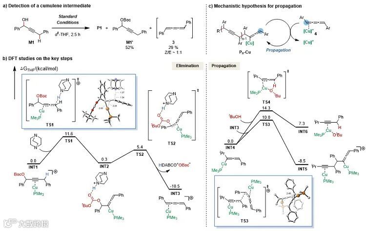 最后,作者对于聚合机理进行了研究(图4)。作者通过核磁实验在聚合过程中监测到了二苯基丁三烯3,其生成经历了铜催化的去质子和β氧消除过程。亲核性的丙二烯基铜物种(Pn-Cu,聚合物链末端)可以加成到铜配位的累积三烯(4)的端位,从而实现聚合物的链增长,这由端基分析的实验所支持。累积烯烃的生成和链增长过程均得到了DFT计算结果的支持。