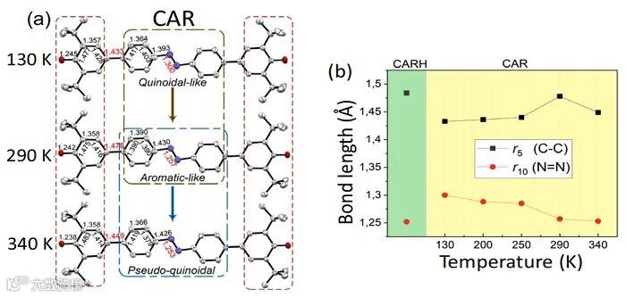 在具体的研究中,首先利用X射线单晶衍射研究热激发对CAR分子结构的影响,如图2所示,在130-290 K逐渐升温的过程中,偶氮苯核的氮氮双键发生分子内的旋转振动导致苯氧自由基和偶氮苯之间的碳碳键键长由1.433 Å增长到1.478 Å,分子结构由醌式结构向芳香结构转变。而当继续升温到340 K时,碳碳键键长反而缩短到1.449 Å,该分子的结构又从芳香结构向醌式结构转变。