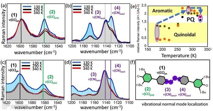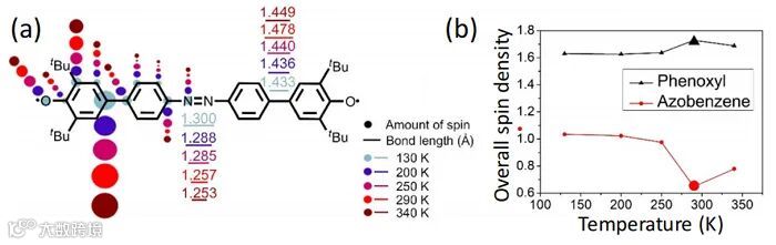 电子科技大学郑永豪教授团队在Nature Communications 发表论文,率先将具有分子内扭转特性(自行车踏板运动)的偶氮苯结构引入,同时结合苯氧自由基,发现了热致结构变化导致反常的自旋分布调控规律(图1)。通过X-ray单晶衍射和变温拉曼的测试分析后,研究发现随温度升高该分子的结构变化由两种运动共同调制,即相邻苯环间的扭转运动和偶氮苯踏板运动。在130-290 K的低温段,分子结构变化主要由苯环间扭转作用导致,即醌式结构向芳香结构转变,但当温度向更高温增加时,偶氮苯的踏板运动的调节作用显著增强,两种运动的共同调制下使得分子结构转而向醌式变化。