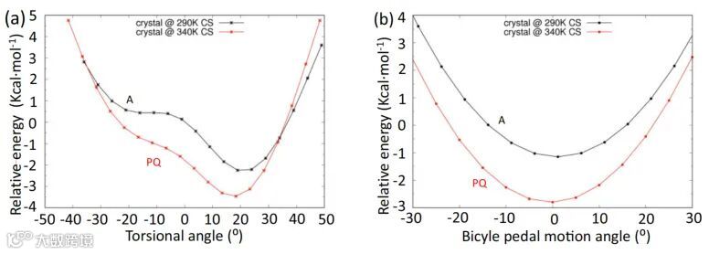 为了解释这种独特的热致结构变化现象,研究中对CAR分子振动的黄昆因子和固态条件下分子的势能面(图5)进行了计算。其结果表明,在低温条件下,升温时的醌式结构向芳香结构的转化是由偶氮苯的扭转振动驱使。温度继续升高时,偶氮苯分子的类似“自行车踏板运动”振动态被激发,同时偶氮苯的扭转振动仍然存在,两种运动耦合使得分子结构趋向醌式,而这个醌式结构与低温下的醌式结构明显不同。