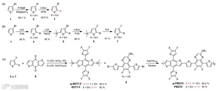 相较于传统的β位氟取代的双噻吩基苯并二噻吩(BDTT-F)单元,α位氟取代的α-BDTT-F单元拥有更短的合成路线,更高的合成产率和更少的纯化次数(见图1),因此具有更低的成本,这有利于大规模制备和商业化应用。