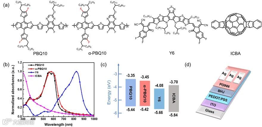 图3. (a) 材料的分子结构、(b) 吸收光谱、(c) 能级以及(d) PSCs器件结构图