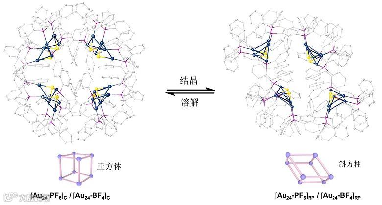 正如预期,当以2-苯基取代的V型1,3-双(二苯基膦)苯配体为构筑模块,通过无模板、一步反应得到正方体结构的金簇笼(图1)。有趣的是,当金簇笼的阴离子由氯离子转变为六氟磷酸根离子或者四氟硼酸根离子时,正方体结构的金簇笼在结晶的过程中会发生结构转换,由正方体结构变成斜方柱结构(图2)。并且,当斜方柱结构溶解时,在溶液中斜方柱结构又会转变为正方体结构(图2)。