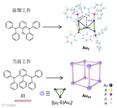 近日,香港大学的任詠华院士团队首次提出,采用“去亲金相互作用”的策略构建金簇笼,并实现其结构可调控转变。该团队设想,利用[(μ3-S)Au3]+这一金(I)硫化物团簇中最小的构筑单元为多面体的顶点,合适的二膦配体作为多面体的边,金簇笼结构是可以被合成出来的。他们从前期工作得到的一个五核金(I)硫化物团簇的结构中获得灵感。他们发现该团簇是由五个金原子和两个V型的1,3-双(二苯基膦)苯配体组成,并且配体骨架上的质子(HA)非常靠近金原子(图1)。设想:如果在HA处引入一个空间位阻较大的取代基会导致两个[(μ3-S)Au3]+单元彼此远离,不利于形成[(μ3-S)Au3]+单元之间的亲金相互作用,从而形成金簇笼结构。