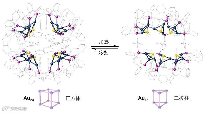 值得关注的是,正方体结构的金簇笼溶液被加热时,研究发现正方体结构的金簇笼也会发生结构转换,由正方体结构变成三棱柱结构(图3)。同时,降低溶液的温度时,研究人员观察到三棱柱结构的金簇笼又会转变为原来的正方体结构金簇笼(图3)。通过变温核磁,高分辨质谱,X射线晶体衍射以及紫外-可见吸收光谱等一系列表征手段对金簇笼的结构转变过程进行了详细的表征。这也是该课题组首次实现了刺激响应诱导的金簇笼的可逆结构转化。