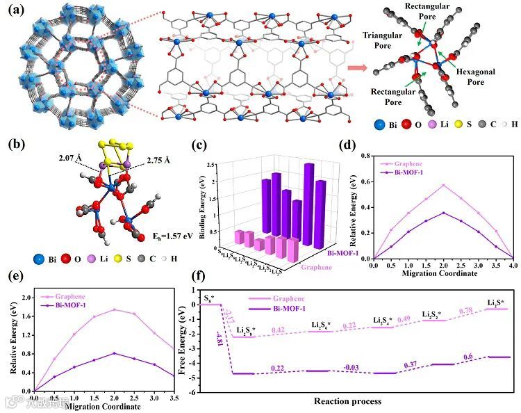 图5. Bi-MOF-1的晶体结构以及对LiPSs吸附/催化转化的模拟计算