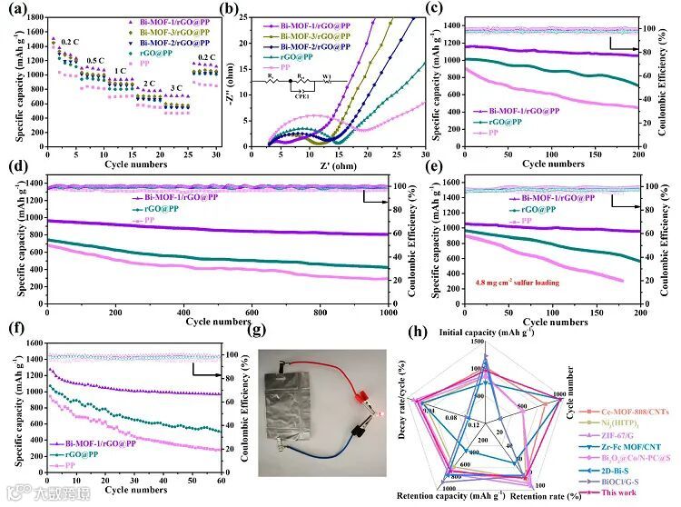 为进一步探究Bi-MOFs中OMS对锂硫电池性能的影响,制备了基于Bi-MOFs与还原氧化石墨烯的复合功能插层膜(Bi-MOFs/rGO@PP)。如图3所示,含有Bi-MOF-1/rGO@PP的锂硫电池表现出最好的倍率性能、循环稳定性,并实现了在软包电池中的应用。