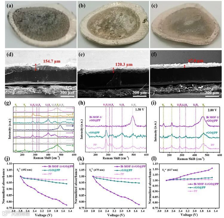 图4. Bi-MOFs应用于锂硫电池插层材料的锂金属负极表征以及原位机理研究