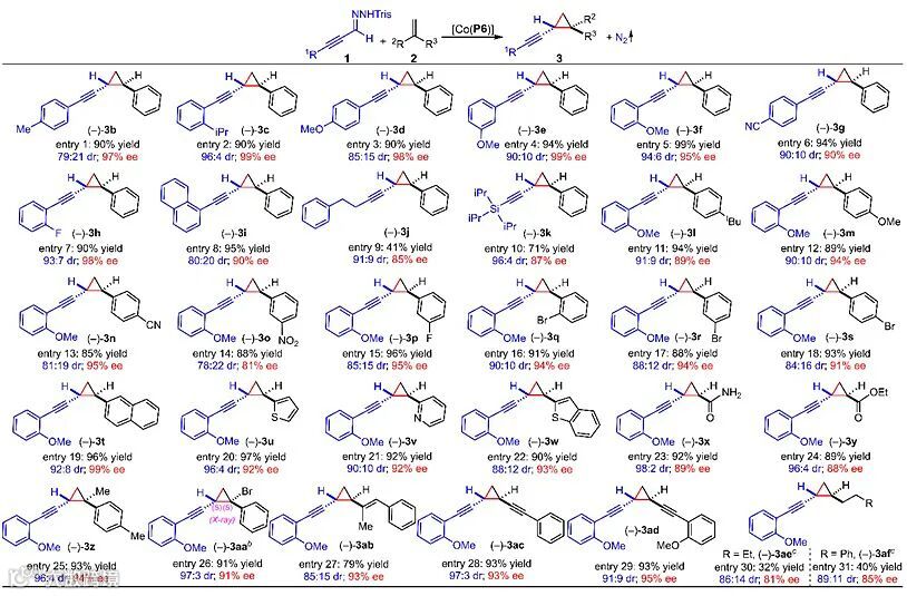 图3. 钴卟啉催化的炔基重氮化合物不对称自由基环丙烷化的底物范围