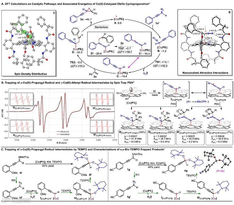 作者之后又对反应机理进行了系统的理论和实验研究,结果如图4所示。首先DFT计算结果表明,该反应的决速步骤为金属自由基活化重氮化合物,对映选择性决定步骤为自由基加成,最后的自由基取代反应是一个快速的几乎没有能垒的过程(图5A)。根据理论计算优化的立体模型可以推测,底物和催化剂之间多种弱非共价键协同作用(包括多重氢键、π-π堆叠作用等)是使得催化剂[Co(P6)]展现出高反应活性和立体选择性的主要原因。其中对中间体C的自旋密度的计算结果显示此中间体有两个共振式,分别为自旋位于α位上的α-Co(III)-炔丙基自由基C以及自旋位于γ位上的γ-Co(III)-丙二烯基自由基C’。为了更进一步了解由中间体C共振效应而产生的分别位于α位和γ位上的自由基,作者进行了电子顺磁共振(EPR)实验和自由基捕获实验从而证实了α-Co(III)-丙炔基自由基和γ-Co(III)-丙二烯基自由基的生成(图5B–C)。