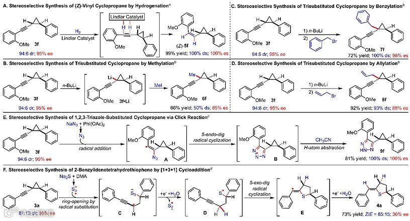 最后,作者对得到的炔基环丙烷进行了一系列转化。通过应用林德拉催化剂,实现了对炔基的还原以得到具有光学活性的顺式烯基取代的环丙烷(图5A)。通过正丁基锂及不同的卤代物作为亲电试剂,得到了手性三取代的环丙烷(图5B–D)。分别用原位产生的叠氮自由基和三硫自由基加成至炔基得到三氮唑取代的环丙烷以及开环产物四氢噻吩(图5E–F)。