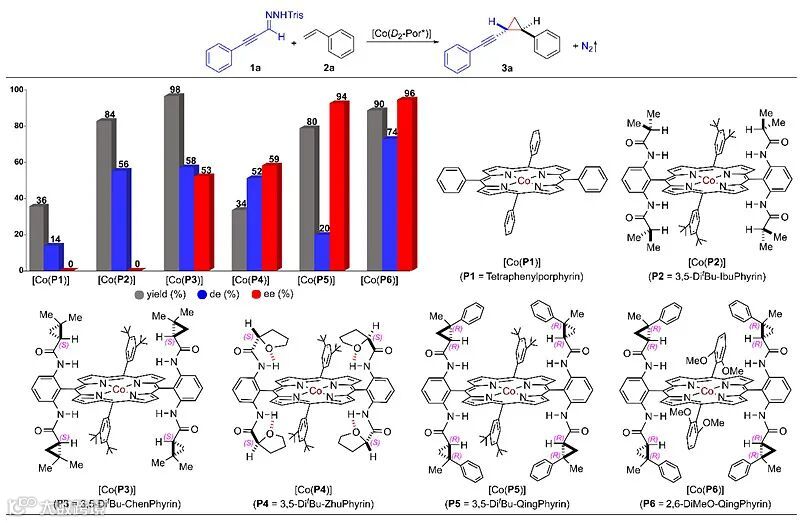 图2. 钴卟啉催化的炔基重氮化合物不对称自由基环丙烷化反应的配体效应