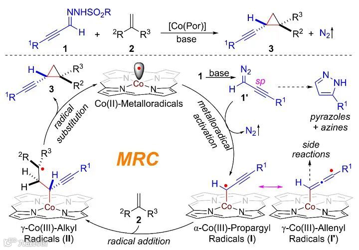 图1. 钴金属自由基催化炔基重氮化合物的不对称自由基环丙烷化反应机理