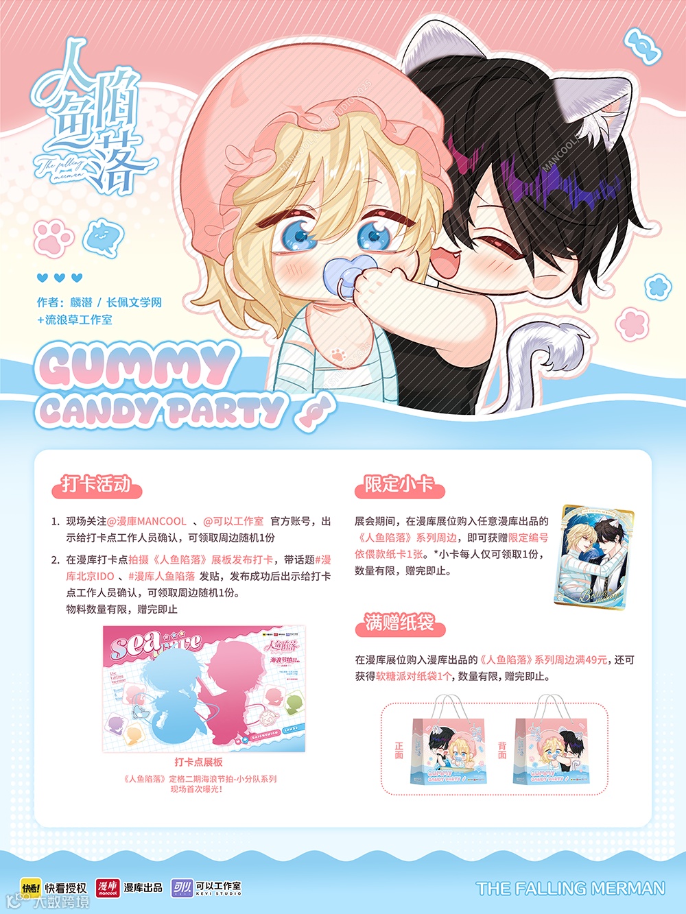 在漫库展位购入漫库出品的《人鱼陷落》系列周边满49元,还可获得软糖派对纸袋1个,数量有限,赠完即止。