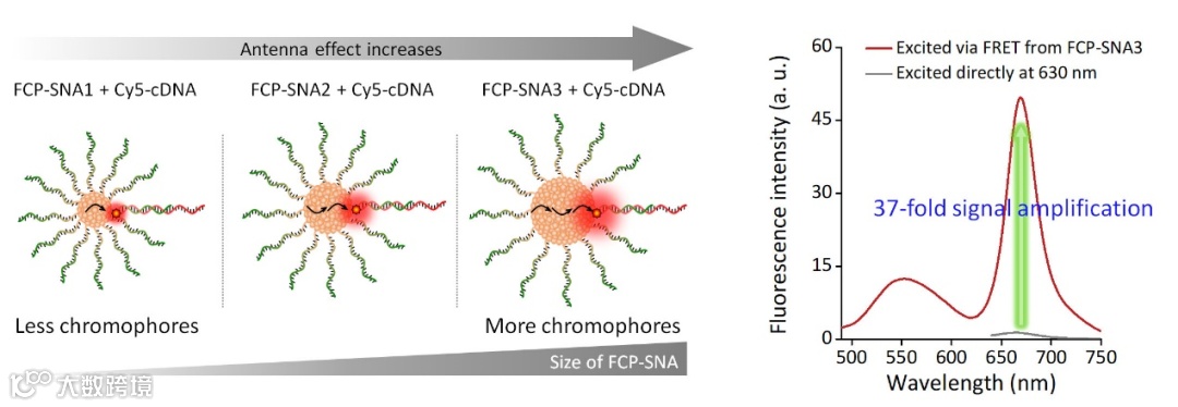 实验结果证实,利用共轭聚合物的“光捕获天线效应”可以实现核酸传感信号的有效放大,共轭聚合物独特的电子结构决定其在纳米“球形核酸”结构内能量转移的范围可超越Förster半径。因此通过调节PFBT-g-DNA双亲聚合物上接枝DNA的数量可以有效调控FCP-SNA“球形核酸”的尺寸,更大的“球形核酸”由更多的发色团组成,最终可实现对受体Cy5荧光信号37倍的放大(图2)。