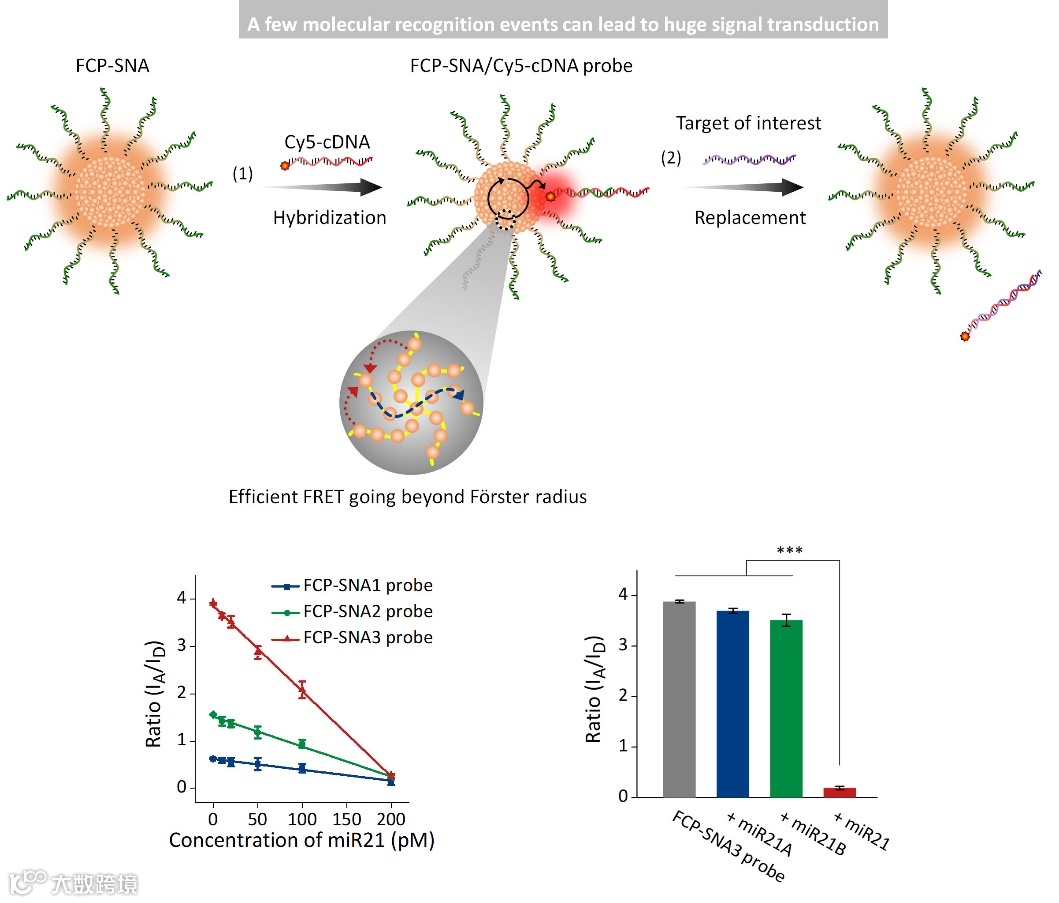 图3. FCP-SNA/Cy5-cDNA超灵敏检测microRNA的原理示意图及其信检测性能。