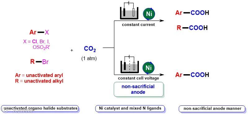 总的来说,该研究利用温室气体CO2作为羧基源,通过电化学发展了一种镍催化的非活化芳基和烷基(类)卤代物的羧基化新方法,并开发了一种实现该反应的非牺牲阳极体系,具有条件温和、成本低、底物适应性广和官能团兼容性高等优点,为重要羧酸化合物的制备提供了新途径。