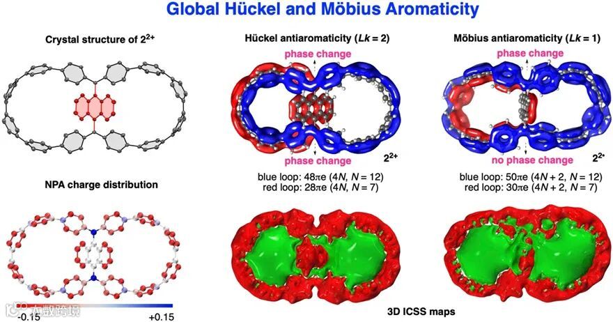 作者首先利用量子化学计算,揭示了碳纳米环单元的引入对不同几何构型及开壳闭壳态能量的影响。随后,作者通过单晶衍射证实了化合物1a、1b 和2的折叠式几何构型。在晶态下,具有大环结构的三个分子显示出多孔性质,其晶胞中孔隙体积占比分别达到23.8%、41.6%和46.7%。通过对三个化合物进行变温核磁 (VT-NMR)、变温电子顺磁共振 (VT-EPR) 测试,作者阐释了1a、1b化合物具有热激发的三线态,但对于化合物2在高温下仅展现出纳米环中苯环的动态旋转,并未发现顺磁物种。另外,三个化合物均表现出典型的动态氧化还原行为,作者通过化学氧化的方法得到了化合物2的双阳离子化合物22+,并通过单晶衍射揭示了其扭曲式几何构型以及电荷的离域性质。电荷离域、双大环分子结构和分子扭曲使得双阳离子化合物22+成为了研究全局芳香性的绝佳模型。根据芳香性规则,当分子π轨道具有一个180度扭曲时,遵从莫比乌斯芳香性规则(4N芳香性);而当分子π轨道具有两个180度扭曲时,遵从休克尔芳香性规则(4N+2芳香性)。作者通过π轨道的拓扑分析以及等化学屏蔽表面(ICSS)计算,揭示了化合物 22+的全局休克尔反芳香性(4N,N=12)和双自由基22·的全局莫比乌斯反芳香性(4N+2,N=12)。