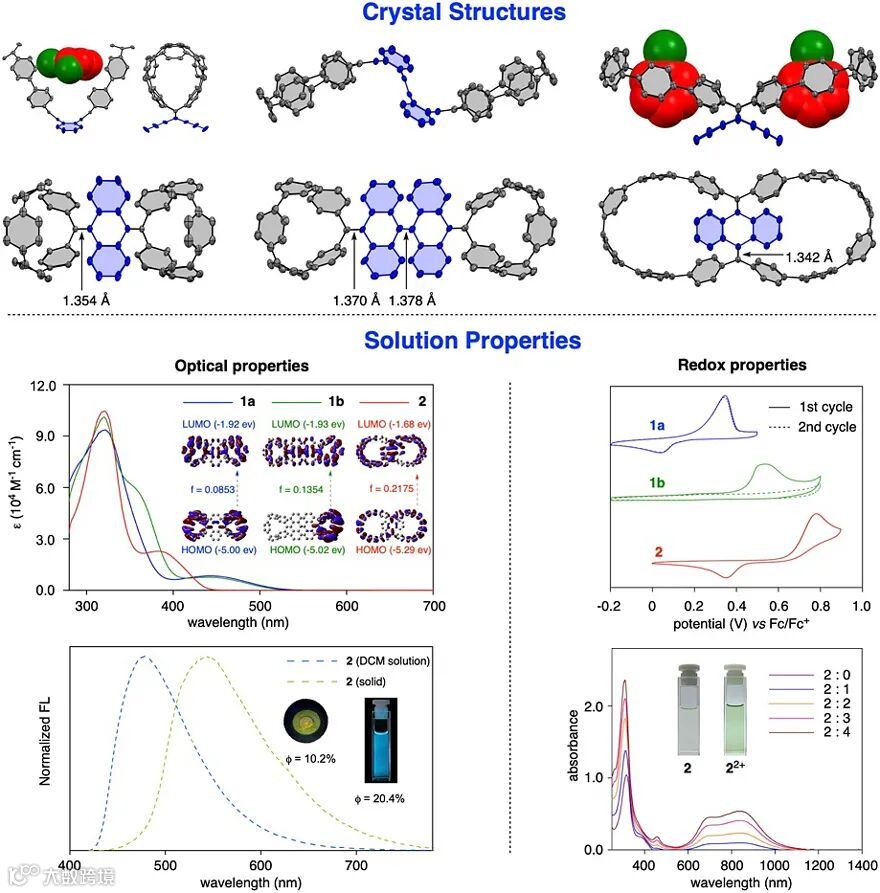天津大学的孙哲团队致力于具有独特几何构型和电子结构的共轭功能材料的设计、合成和应用。该团队基于此前对碳纳米环二聚体的研究 (Angew. Chem. Int. Ed., 2021, 60, 7649-7653, VIP paper, 点击阅读详细),通过巧妙地合成设计,首次将AQD单元与碳纳米环单元进行结合,高效且区域选择性地合成了两类具有不同拓扑结构的碳纳米环封端的OCE体系 (Type I: 1a, n = 1; 1b, n = 2; Type II: 2)。