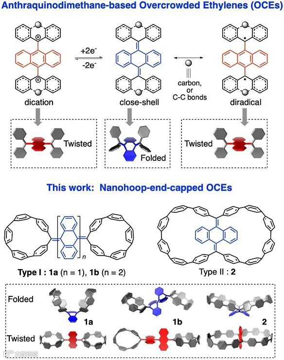 具有可变的多重分子构型和电子构型是构筑刺激响应材料的重要分子基础。例如,当分子构型的改变伴随开壳/闭壳态或中性/离子态变化时,材料会表现出独特的对光照、电场、磁场的响应以及动态氧化还原行为(dyrex),从而可应用于信息处理、存储、传感器等多个领域。近年来,基于蒽醌二甲烷 (Anthraquinodimethane, AQD) 的拥挤烯烃 (Overcrowded Ethylenes, OCEs) 类化合物为此类材料的典型代表,其闭壳结构通常以折叠式的构型 (folded-form) 存在,而开壳双自由基及双阳离子主要以扭曲式几何构型存在 (twisted-form)。因此,其分子结构的改变伴随着磁性、颜色等物理性质的改变。通常,多个几何构型和电子构型间由张力、芳香共振能等导致的能量平衡是决定其性质的重要因素。因此,如何通过合理的分子设计控制其几何/电子态的变化对深刻了解此类化合物的性质,以及开发新颖功能性材料具有重要的意义。