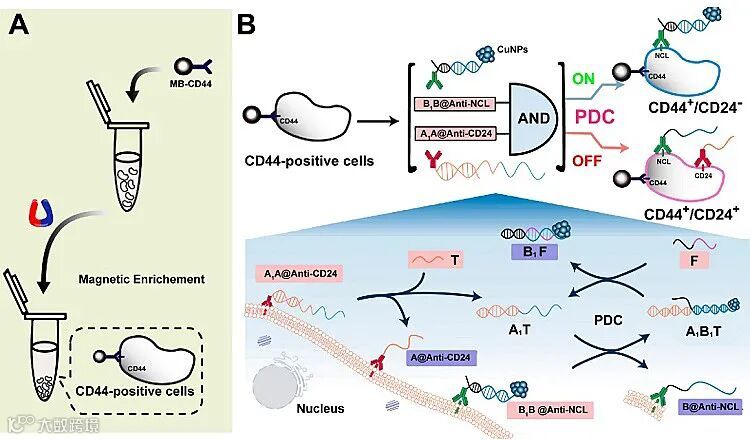 本文作者设计了一种基于原位可编程回路(PDC)的电化学方法确定干细胞样表型的新思路(图1)。CD44阳性(CD44+)乳腺癌细胞首先富集在CD44抗体功能化磁珠(MB-CD44)表面。随后,细胞表面发生的原位PDC可以有效降低CD24阳性(CD24+)干扰细胞带来的背景信号。原位PDC反应中,乳腺癌细胞表面过量表达的生物标志物——核仁素(NCL)与CD24共同作为膜表面的锚定位点,而两种捕获探针(A1A@Anti-CD24和B1B@Anti-NCL)和两类效应探针(T和F)用于协同促发原位PDC。具体而言,T通过与A1A@Anti-CD24和B1B@Anti-NCL依次反应,生成并释放A1B1T;F与释放的A1B1T反应,促进A1T的再生,加速消除细胞表面的背景信号。原位PDC后,CD24+细胞表面的信号链B1 (CuNPs-B1)被去除。然而,当细胞表面不存在CD24时,PDC不会发生,信号链CuNPs-B1会保留在细胞表面。因此,作者提出了一种“always-ON”的电化学表型方法,可以通过使用电化学技术检测膜表面的伏安信号,选择性鉴别乳腺肿瘤的干细胞样表型。
