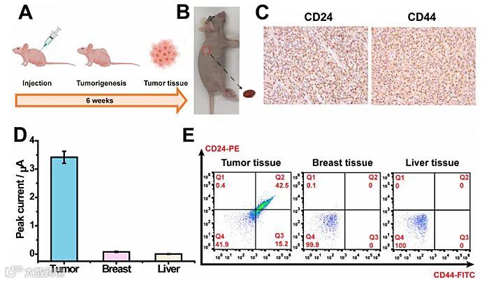 最后,作者将该方法用于鉴定具有干性表型的三阴性乳腺癌细胞MDA-MB-231,并依此研究了药物对干性表型的逆转作用(图3)。在MDA-MB-231异种移植瘤小鼠模型中,该电化学表型分析方法再次证明了其对干性细胞亚群识别的准确性和灵敏性,其电化学响应与正常组织形成明显对照且与FCM分析结果相一致。因此,基于原位PDC的电化学表型方法为乳腺肿瘤中占比稀少的干细胞亚群精确鉴别提供了新的分析思路和技术支持。