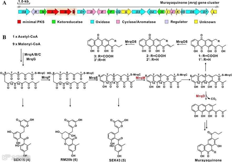 前期研究中,村山醌生物合成基因簇包含三个典型的短链脱氢酶(MrqF、MrqH和MrqM),但是在推测的村山醌生物合成过程中,只需要其中的两个酶MrqF和MrqH发挥作用,而第三个短链脱氢酶MrqM似乎是冗余的。敲除mrqM基因的突变株主要积累代谢产物(SEK43)。从结构上看SEK43只是完成了村山醌合成中第一个环的环化与芳香化,而没有形成第二个环,这暗示MrqM与村山醌第二个环的环化酶切相关。