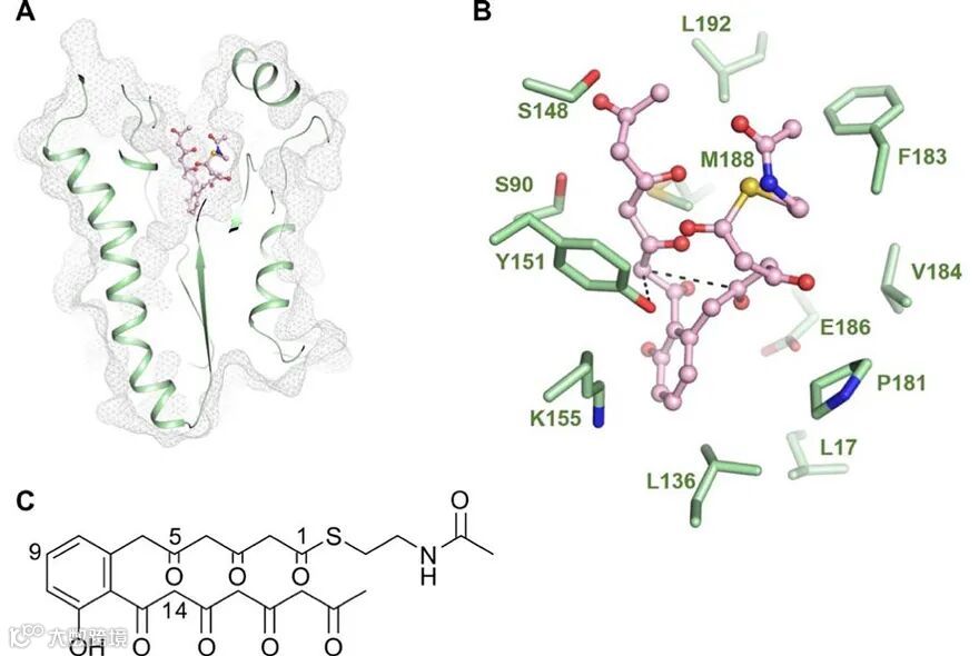 图3. 聚酮化合物底物在MrqM 结合口袋中的对接模拟示意图