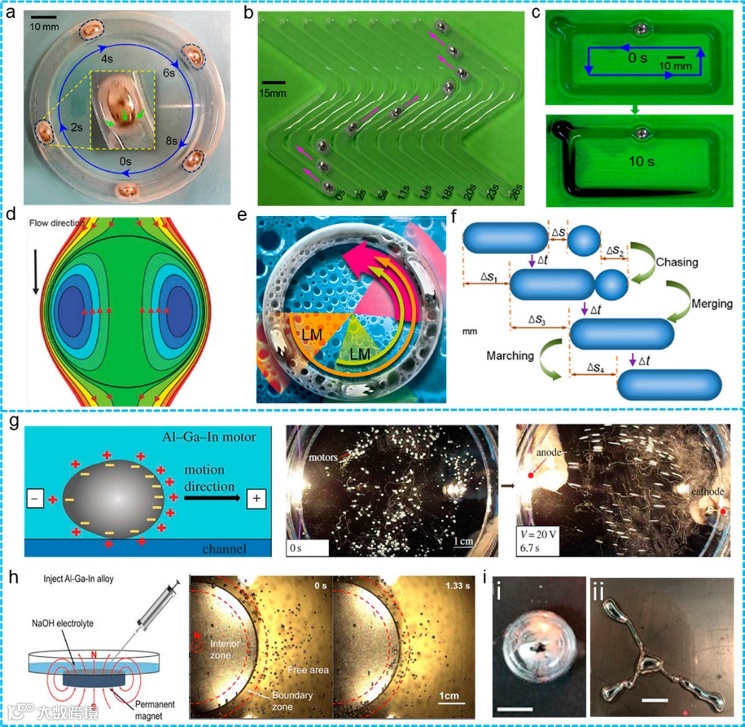 2014年末,团队于世界上首次发现了一种异常独特的液态金属自驱动现象和机制,即液态金属可通过吞食微量“铝箔”后形成全柔性自驱动机器(图4),速度达每秒厘米级且可持续运行数小时,运动过程中液态金属机器还可根据轨道角度和宽度调整自身形状,实现无需外界能量供应的自主变形和运动,且在分离和组装后仍保持运动;若将这种自驱动液态金属打散,可瞬间生成大量快速运动的微马达群,它们在电场作用下可形成高速定向运动,在磁场下则表现出磁陷阱效应(图4)。这一系列工作为研制实用化智能马达、血管机器人、流体泵送系统、柔性执行器乃至更为复杂的液态金属机器人奠定了理论和技术基础。