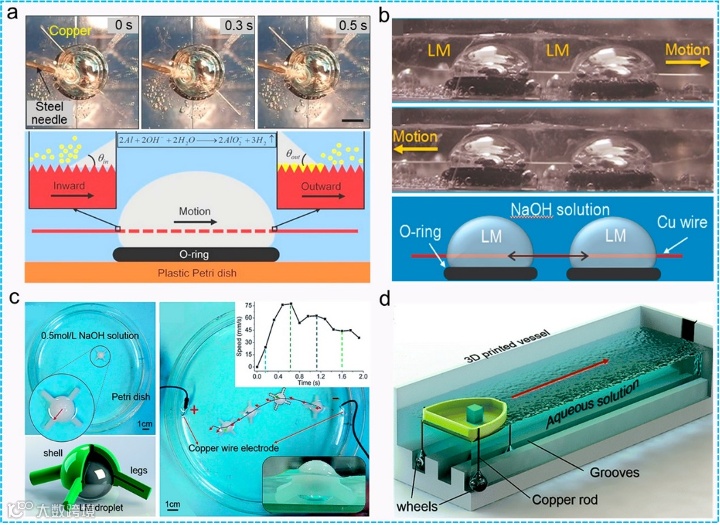 在本综述中,作者还梳理了团队首次发现的一系列液态金属固液组合机器效应(图5),其中,在液态金属基自激振荡效应中,实验揭示:经预先处理的铜丝触及含铝液态金属时,会被迅速吞入并在液态金属基座上作长时间往复运动,如同小提琴被拉动的琴弦一般,其振荡频率和幅度可通过另一金属如不锈钢丝触碰液态金属来加以灵活调控。这一突破性发现革新了传统的界面科学知识,也为柔性复合机器的研制打开了新思路,相应架构也可用作流体、电学、机械及光学系统的控制开关。而液态金属结合低沸点工质,还可实现大尺度变形的柔性机器架构,如自由变形的软体章鱼、定向蠕动的软体动物等。