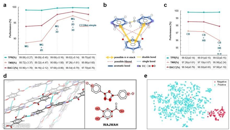 为了证明其特征表示和模型框架的先进性,作者做了消融实验(图2)。特征对比实验的结果揭示:虽然分子图具有强的结构表达能力,但是图神经网络在有限的数据中不能有效学习到与共晶形成密切相关的三维结构信息,因此与三维结构相关的描述符的引入显著提高了模型的准确率(图2a),指出了先验知识可提升深度机器学习在有限数据中对样本特征的学习能力。多头注意力的引入可进一步抓住对共晶形成有重要作用的氢键作用和ππ相互作用,模型同时在信息传递阶段和读出阶段的特征融合方式可以进一步提升模型准确率,基于这样的特征融合表征和模型框架,正负样本能够在变量空间中有效分开,为模型的高准确度奠定了基础,其在交叉验证集中的预测准确度明显高于7个竞争性模型(3个传统机器学习和4个深度学习模型)。作者所提出的这些构建策略可为深度机器学习的应用提供指导和参考作用。