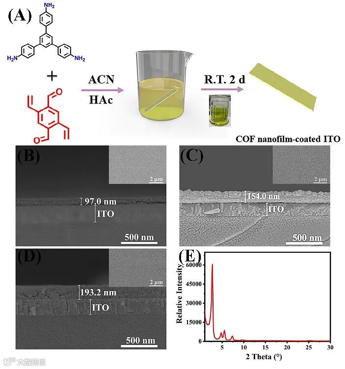 本文通过一种简便的方法,在室温下于ITO板上合成了一种可批量制备、厚度可控、大面积均一、稳定的COF纳米膜(图1),并首次将其作为SALDI基底用于小分子药物5-FU的研究。且由于COF纳米膜均匀且不需要额外的基质喷涂,进一步将其扩展到组织成像研究,观察5-FU在裸鼠肝脏中不同时间间隔的空间分布。