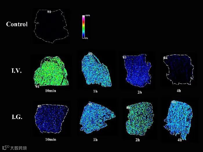 图4. 裸鼠肝组织中5-FU不同时间间隔的空间分布(Control:对照组;I.V.:静脉注射组;I.G.:灌胃组)。