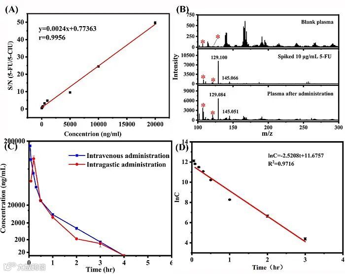 5-FU是一种常用的治疗恶性肿瘤的细胞抑制剂。考虑到血液中药物浓度对疗效的影响,建立一种简便、可靠的5-FU监测方法具有重要意义。因此,进一步将基于COF纳米膜的SALDI-MS应用于5-FU的药代动力学研究(图3),证明了该方法在复杂实际样品中的实用性。