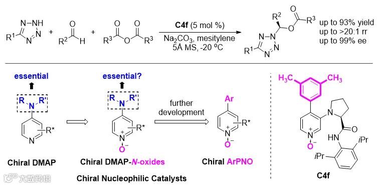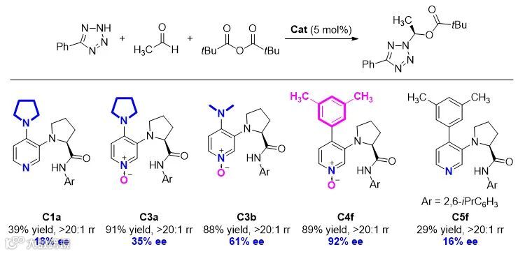 实验发现,在5-苯基四氮唑、乙醛和特戊酸酐的反应中,4-芳基吡啶N-O C4f的催化效果(92% ee)显著高于手性DMAP C1a(18 % ee)、DMAP-N-O C3a (35% ee) 和 C3b (61% ee),以及手性 4-芳基-吡啶 C5f (16% ee)。