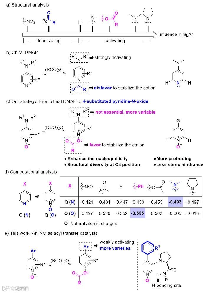 手性DMAP是一类经典的酰基转移催化剂,以吡啶氮为亲核位点,吡啶环C4位均连接二烷基氨基以增强其亲核性。当将手性DMAP变为DMAP-N-O后,其亲核性是增强还是减弱呢?C4位的二烷基氨基还是必不可少的吗?能否换成其他基团,从而增加催化剂结构的多样性?