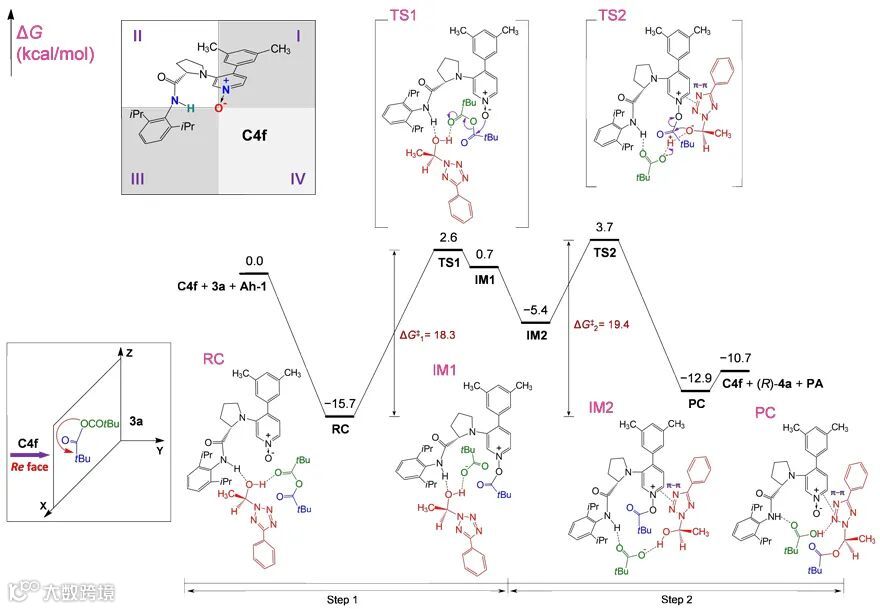该研究通过实验及详细的理论计算,深入阐述了反应机理。基于催化剂C4f主功能部位吡啶-N-O和辅助功能部位氨基N-H,首先采用象限法分析可知催化剂C4f的活性区域为第Ⅱ象限,如图5左上部分所示。采用量子化学方法对反应路径进行分析计算可知该反应为两步过程,第二步即是该反应的速度决定步骤,也是对映体决定步骤。