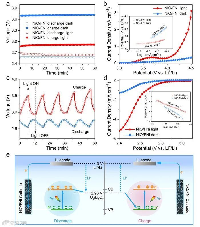 图5. 光场辅助Li–O2电池的电池性能测试。a)电池在有无光照下的充放电曲线;b)放电后的光电极的OER过程的LSV曲线;c)电池的ON-OFF曲线;d)电池的ORR过程的LSV曲线;e)光场辅助Li–O2电池的充放电机制。