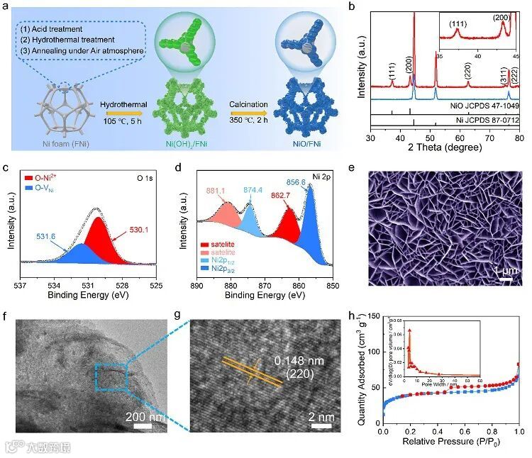 图2. NiO/FNi的结构表征 a)NiO/FNi合成示意图;b)样品的XRD图谱;c-d)样品的XPS图谱;e)样品的SEM图像;f-g)样品的TEM图像;h)样品的N2吸附曲线,内部插图为孔径分布。