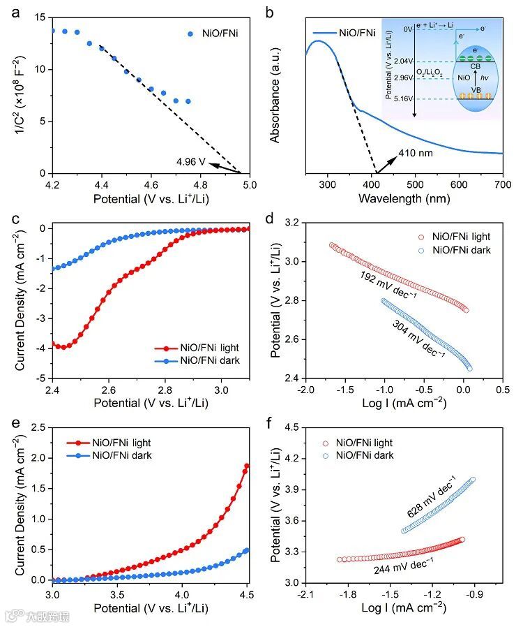 图3. NiO/FNi的光电性能测试。a)样品的M-S图;b)样品的紫外可见吸收光谱;内部插图为能带示意图;c)样品在有无光照下ORR过程的LSV曲线;d)样品在无光照下ORR过程的Tafel斜率;e)样品在有无光照下OER过程的LSV曲线; f)样品在无光照下OER过程的Tafel斜率。