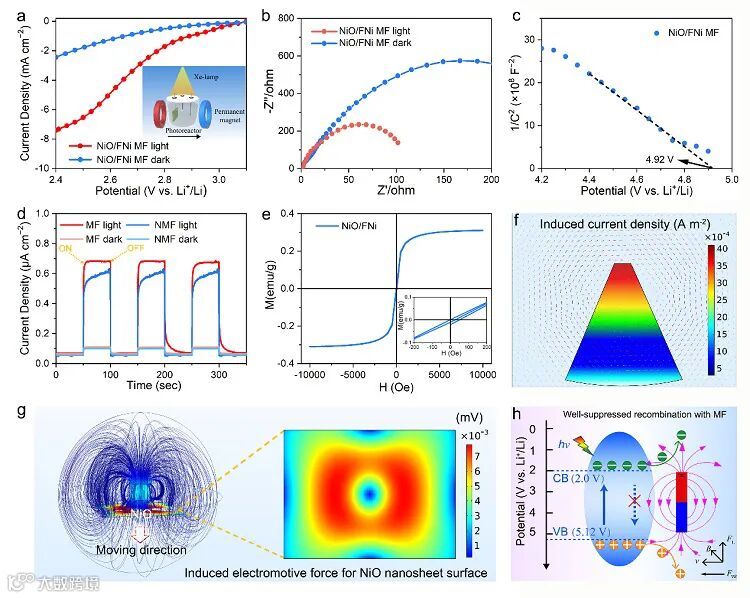 图4. NiO/FNi在磁/光多场耦合下的光电性能测试。a)样品在恒定磁场下有光和无光下的ORR过程的LSV曲线;b)样品在恒定磁场下有光和无光下的EIS曲线;c)样品在恒定磁场下的M-S图;d)样品在有无恒定磁场下以及有光和无光下的I-T曲线;e)样品的M-H曲线;f-g)通过COMSOL得到的样品的感应电势分布;h)在磁场下光电极的能带示意图。